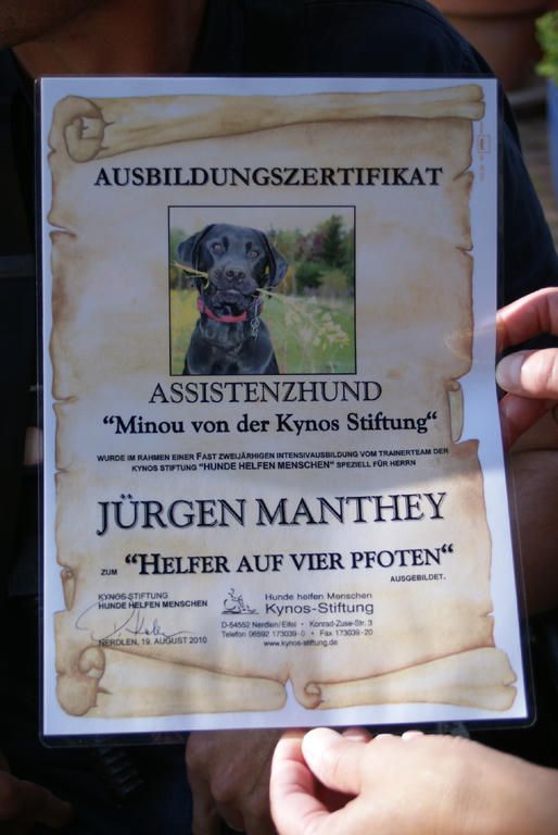 Aber wie bereits erwähnt, ist die Ausbildung mit sehr viel Aufwand und hohen Kosten verbunden, die auch nur dadurch zu bewältigen ist weil es Leute wie Familie Haase gibt, die die Ausbildung ehrenamtlich ausführen! Also bitte zögern sie nicht an die Kynos Stiftung zu spenden, damit möglichst viele Bedürftige in den Genuss eines Behindertenbegleithundes kommen können!