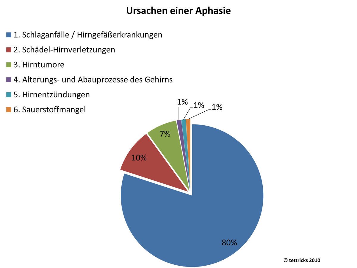 Die häufigste Ursache für Aphasien sind Schlaganfälle (ca. 80%). Diese werden durch Verengungen bzw. -Verschlüsse (ca. 85%) der gehirnversorgenden Blutgefäße (Arterien) oder durch ein Platzen der Gefäße (ca. 15%) mit nachfolgender Hirnblutung ausgelöst. Durch die Unterbrechung der Blutversorgung bestimmter Hirnareale werden Funktionen des Gehirns außer Kraft gesetzt. Das entsprechende Hirngewebe stirbt ab. Sind 3 wesentliche Sprachregionen betroffen, führt dies entsprechend auch zu Ausfällen sprachlicher Funktionen. Weitere Ursachen für Aphasien können Hirntumore, Schädel-Hirn-Traumen (Unfälle mit Kopfverletzungen) oder entzündliche Erkrankungen des Gehirns sein.