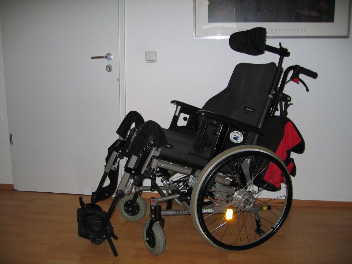 Langes Liegen ist ungesund und macht dazu depressiv. Es ist wichtig, so oft wie möglich außerhalb des Bettes „mobilisiert“ zu werden. Wenn man nicht mehr in einem normalen Rollstuhl sitzen kann, weil z.B. die Rumpfstabilität es nicht zulässt oder die Spastik zu stark ist, dann kommt ein Pflegerollstuhl zum Einsatz. Er wird auch Multifunktionsrollstuhl genannt, da man den Sitz, die Rückenlehne, die Kopfstütze, Armauflagen und die Fußteile verstellen kann. Alles ist gut gepolstert. In diesen Rollis kann man relativ bequem längere Zeit verbringen. Anfangs habe ich es nur kurz darin ausgehalten, weil mir der Hintern so weh tat durch die fehlende Muskulatur. Dann steigerte ich mich auf wenigen Stunden und verbrachte später den ganzen Tag darin. Infos zu dem sehr guten Rolli gibt s hier!